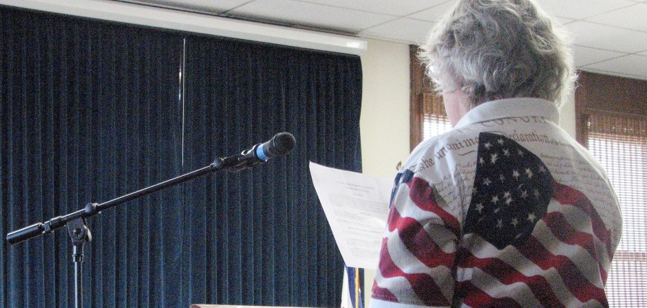 Wearing a shirt with the words “Unanimous Declaration of Independence of the Thirteen States … July 4, 1776,” along with autographs of the original signers of the document, Marilyn Totzkay of Crystal addresses the Montcalm County Board of Commissioners on behalf of the Michigan De Jure concept. — Daily News/Elisabeth Waldon