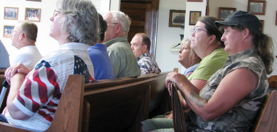 Marilyn Totzkay of Crystal, wearing a shirt with the words “Unanimous Declaration of Independence of the Thirteen States … July 4, 1776,” along with autographs of the original signers of the document, listens along with fellow supporters as her husband, Robert Gilman, addresses the Montcalm County Board of Commissioners regarding the Michigan De Jure concept. — Daily News/Elisabeth Waldon