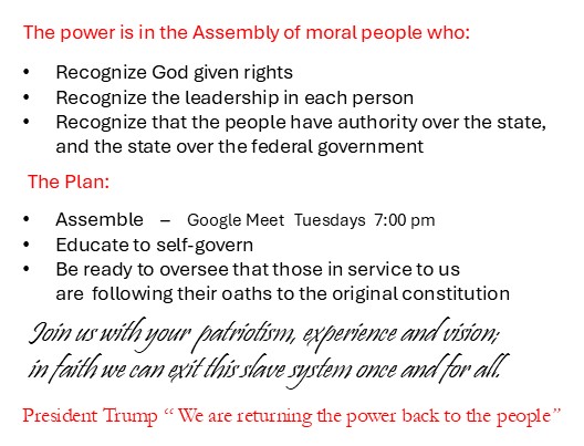 As an addition to my Jan 13, 2025 post, I would like to add a link to an informative Telegram channel. "Assembly Required" was created for the purpose of providing education in another format, with the additional possibility of connecting with others in our state via Direct Messaging from the site. It is an ever-growing work, with much of the contents derived from this National site, Restore America, The People's Authority, Kirk's Law Corner, and other public sources pertaining to the Constitution, historical documents, and information for assembling our states and counties.
