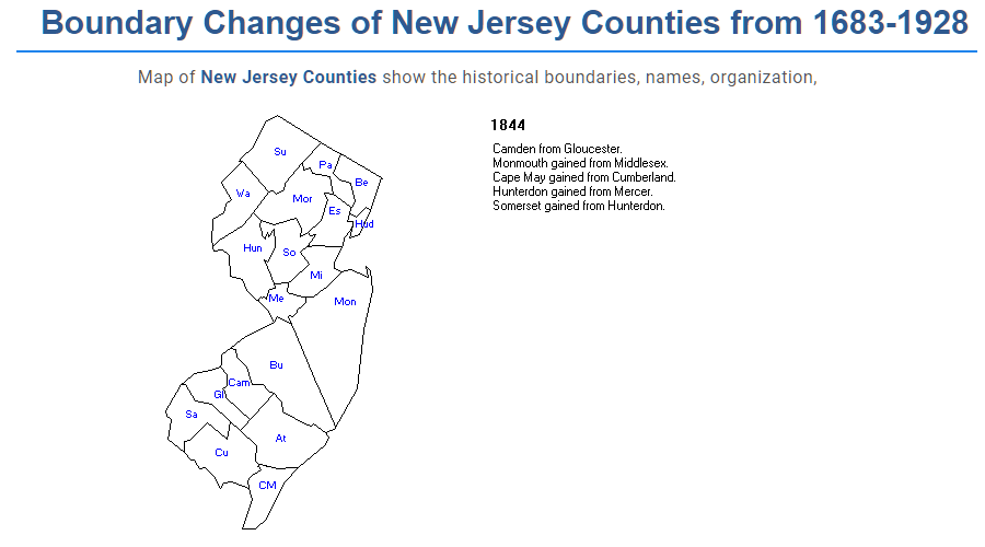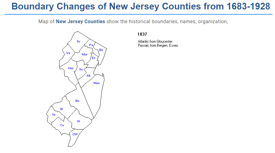 there was a site that tracked all the US counties development from ~1600s to present. it has been taken down. the URL was https://MyCounties.com but now just reports an error to the database... unfortunate that this history has been removed but that is the general pattern. I captured some of the NJ counties and attached them here. The dates are on each image and what counties were divided. I wish I captured them all. Lesson Learned...